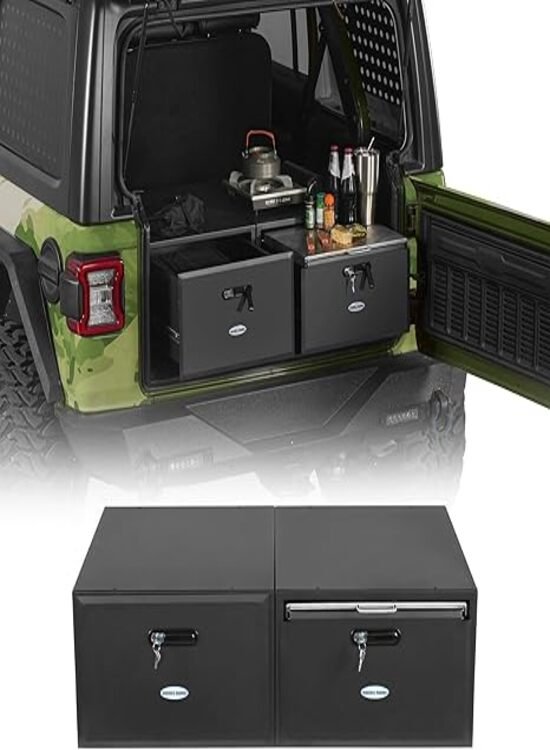 Durability is engineered into every weld. Constructed from 16-gauge cold-rolled steel and finished with a textured black powder coat, the Hub is designed to withstand scratches, corrosion, and the harshest trail conditions. The top surface functions as a 16-gauge stainless steel worktop, rugged enough to stack heavy luggage or camping containers on top. Despite its heavy-duty 119lb build, installation is a “Quick Route” process—a direct bolt-on design that requires no drilling or vehicle modification, preserving the integrity of your Jeep or Bronco.